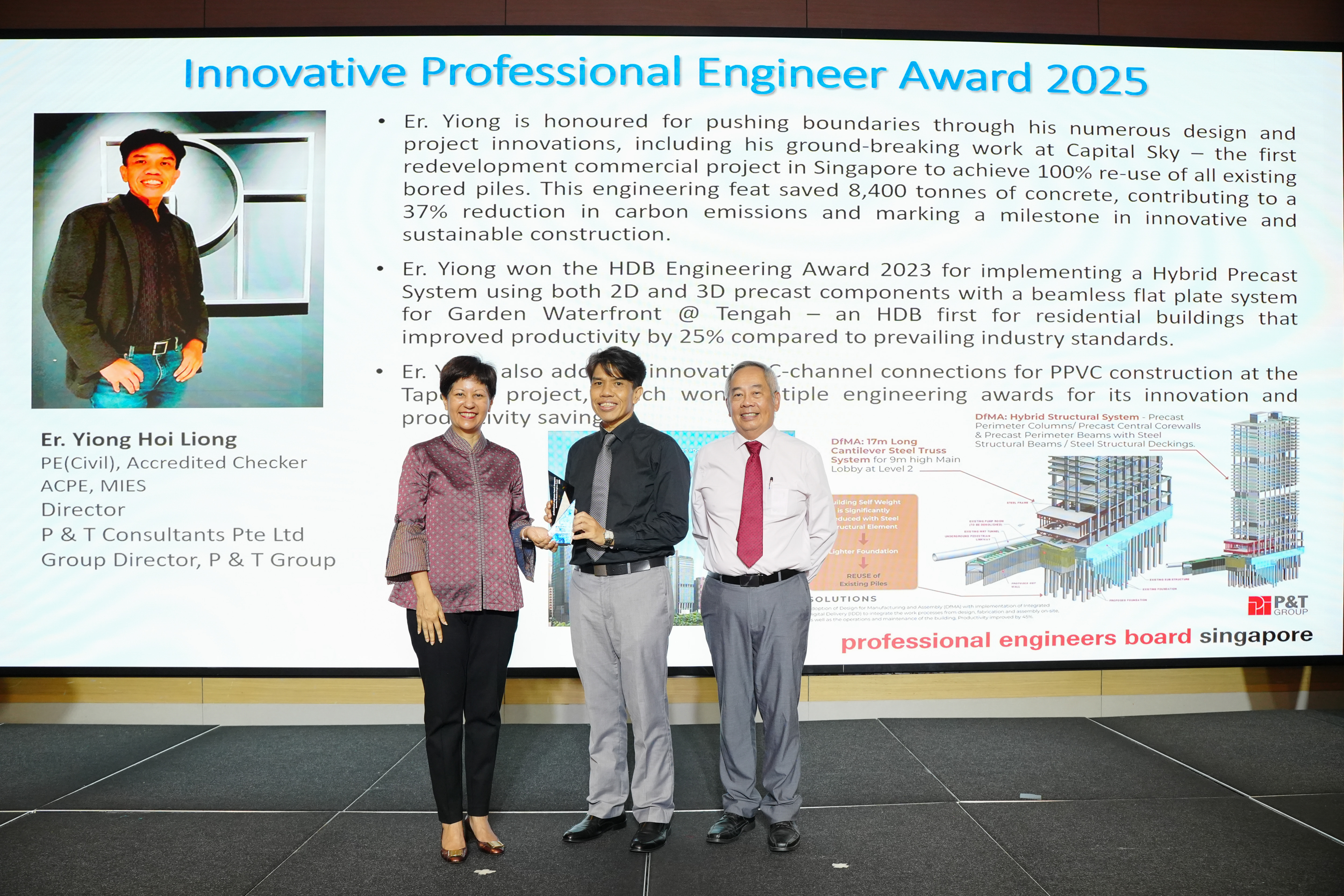 The ceremony honoured Er. Yiong Hoi Liong as this year's Innovative Professional Engineer Award recipient, exemplifying engineering excellence and creative problem-solving. His groundbreaking innovation for CapitaSky marked a milestone in sustainable construction as Singapore's first commercial redevelopment project to achieve 100% reuse of existing bored piles. This engineering feat saved 8,400 tonnes of concrete, resulting in a 37% reduction in carbon emissions and demonstrating exceptional environmental stewardship.